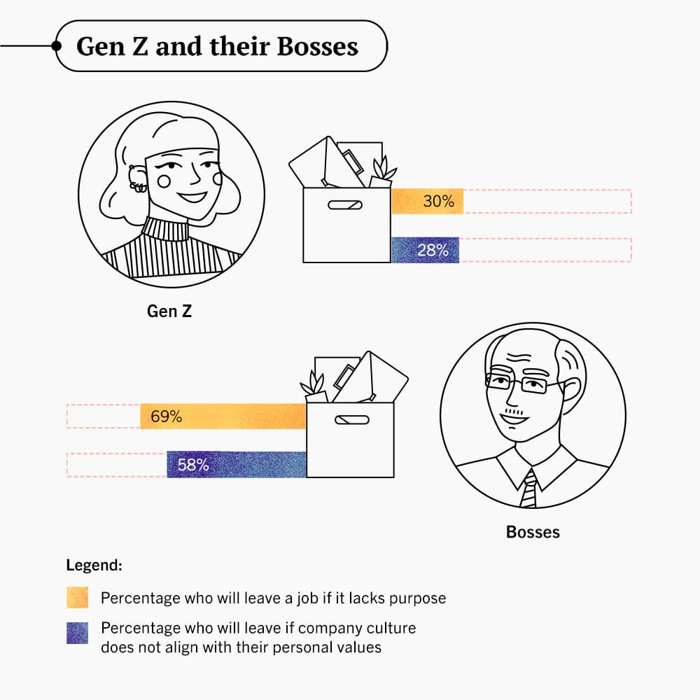 One survey found that only 30 per cent of Gen Z workers would leave a job that lacked “purpose”. If the company did not align with their personal values, most would stay, nonetheless. Only 28 per cent were strident enough to leave for such a reason.